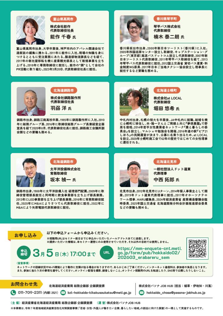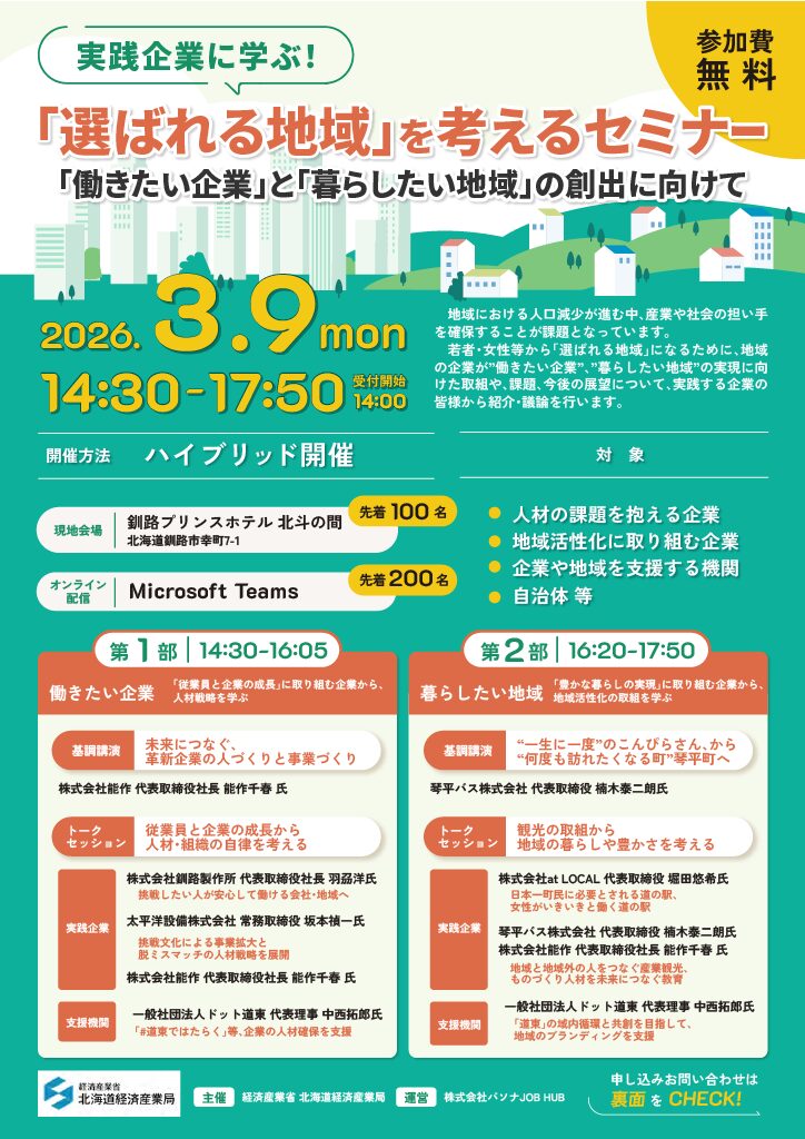 2026年3月9日(月)に開催される、北海道経済産業局主催、人口減少や人手不足等の企業や地域の課題に対応する実践企業のセミナーに代表理事 中西が登壇します。