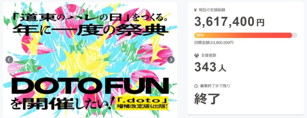 そんな思いを込めた「DOTO FUN」プロジェクトの仲間を1000人集めるため、クラウドファンディングに挑戦。343人の方から3,617,400円のご支援をいただきました。たくさんのご支援を、誠にありがとうございます。